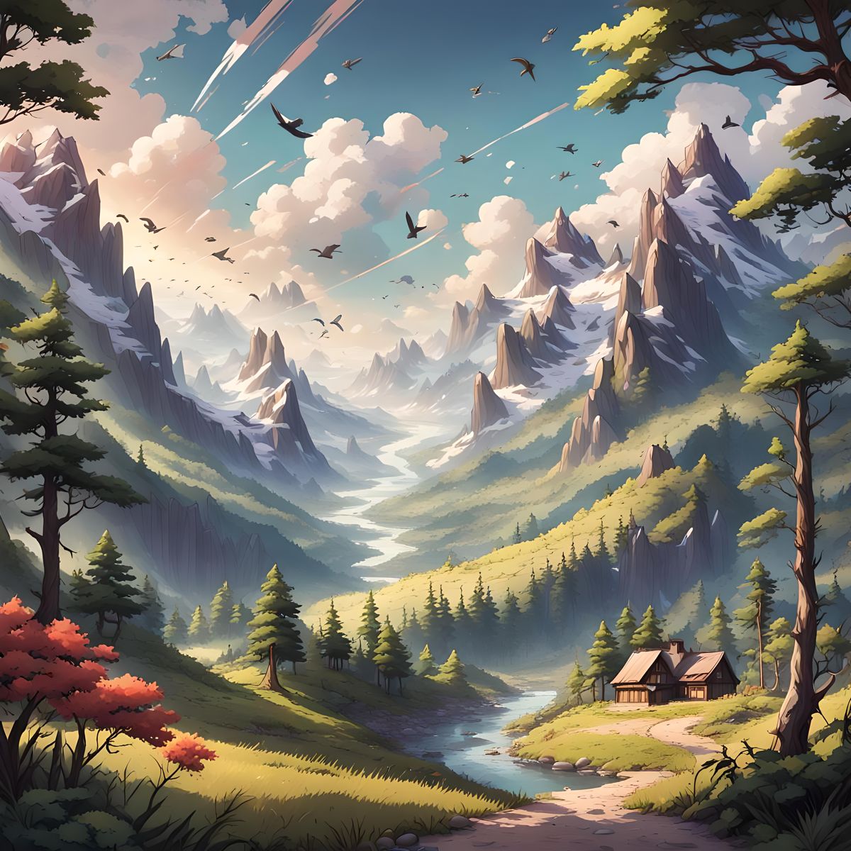 This image shows a vibrant landscape featuring towering mountains, a lush forest, and a winding river. In the distance, a small village is visible under skies filled with birds, as 3D anime art.