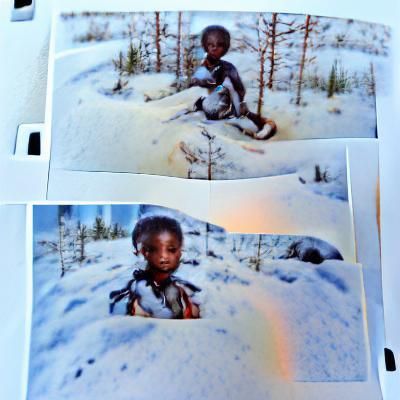 This image shows a vintage polaroid photograph from December 24th, 1981, depicting a scene near Kiruna, Sweden, capturing the essence of a traditional Swedish Christmas.