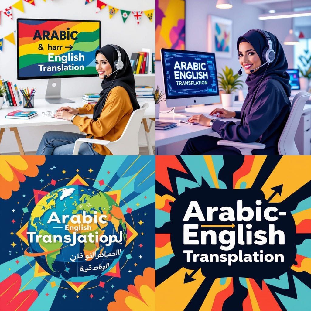 This image shows a Fiverr gig cover design. It features bright colors and a clean, simple aesthetic promoting Arabic to English translation services.