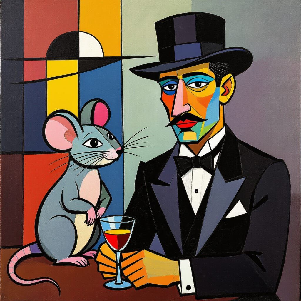 This image shows a mouse dressed as a 1920s gigolo in a speakeasy. The scene is rendered in a cubist style, reminiscent of early 20th-century modern art.