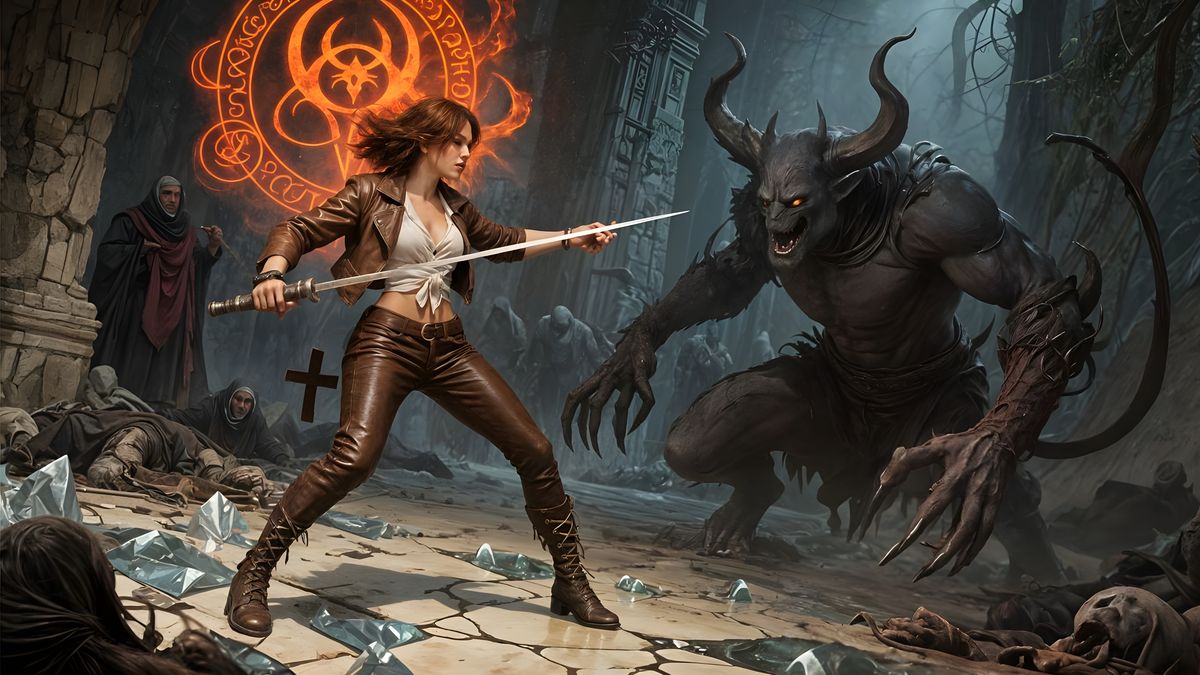 This image shows a woman with a rapier battling a demon in a ruined temple filled with corpses. The scene is depicted as a detailed realistic fantasy illustration with dramatic lighting and a romantic atmosphere.