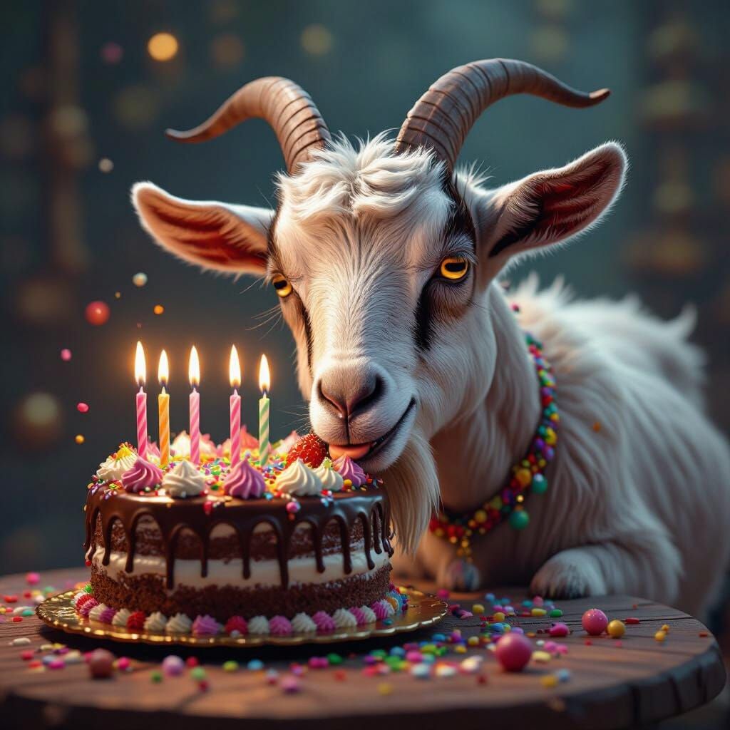 This image shows a goat with a glint in its eye, sneakily biting a richly decorated chocolate birthday cake. The scene features deep jewel tones and fantastical details, rendered in a matte painting style.
