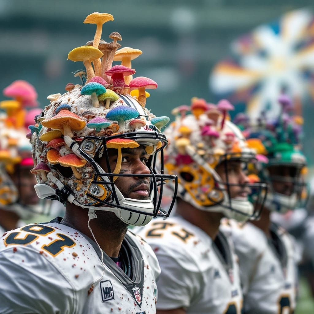 This image features football players wearing unique helmets creatively designed to resemble vibrant, colorful mushrooms, offering a whimsical take on sports gear.
