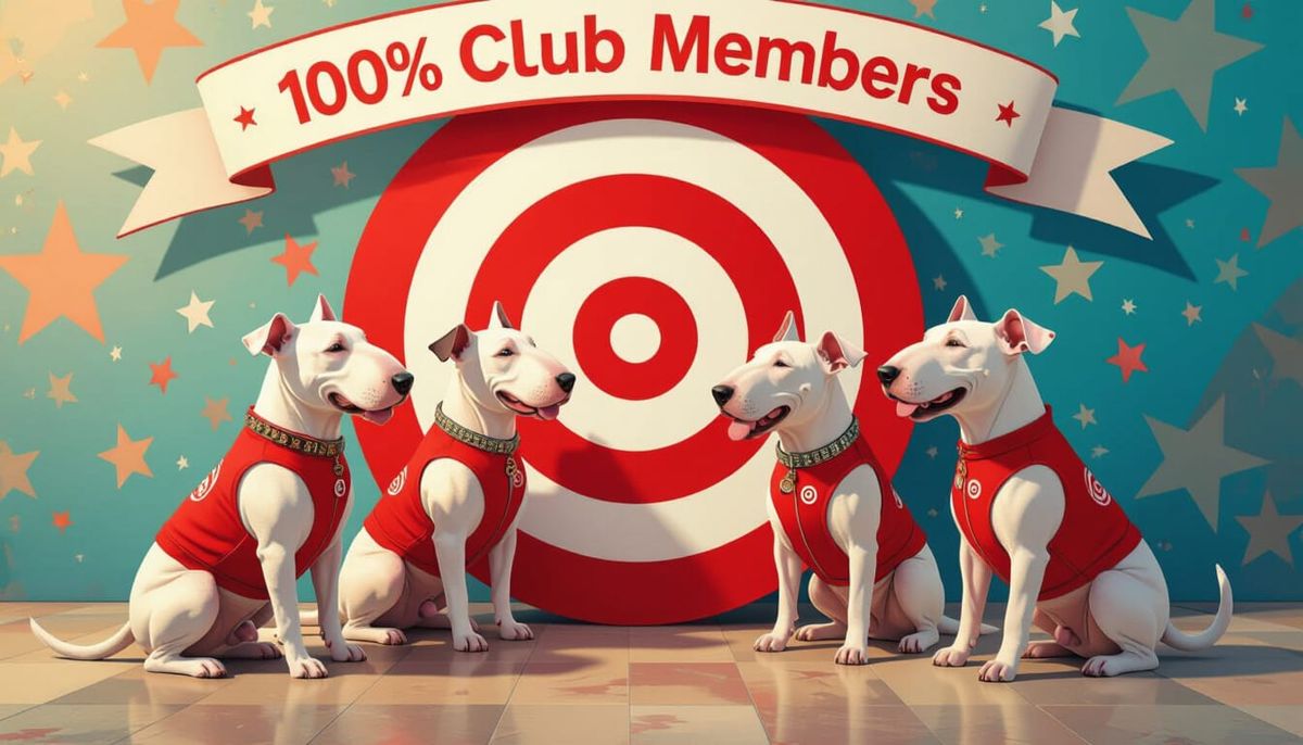 This image shows four bull terriers in Target-themed attire celebrating their membership in the "100% Club". The splash art style features intricate textures, dramatic lighting, and a colorful background.