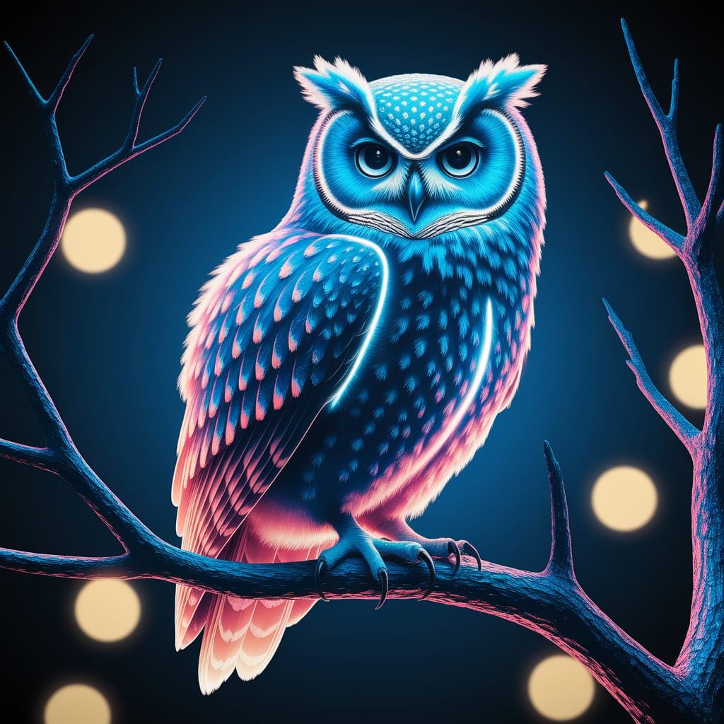 A vivid image of a glowing blue owl with iridescent feathers. The owl is perched on a branch against a dark blue background enhanced with bokeh lights in a photorealistic style.