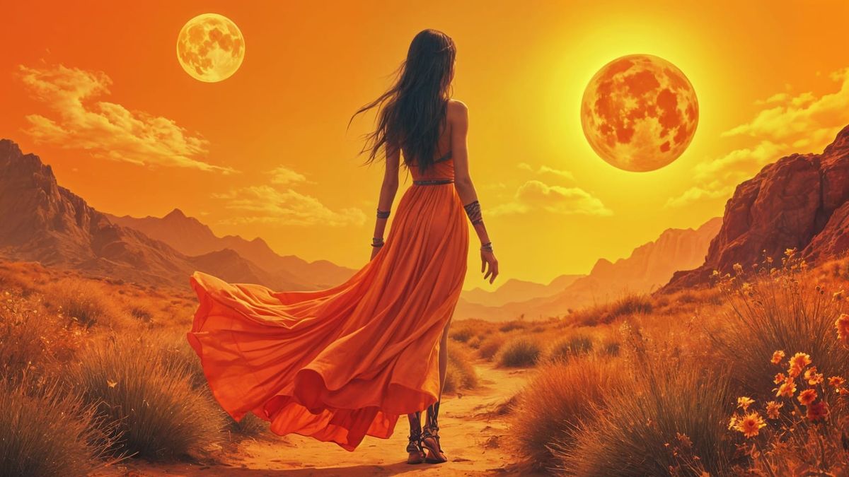 This image depicts a striking elven cyborg in a flowing orange gown, walking through a Martian garden under two orange moons. The artwork features a vibrant, high-contrast retro-futuristic style with a rich orange color palette.