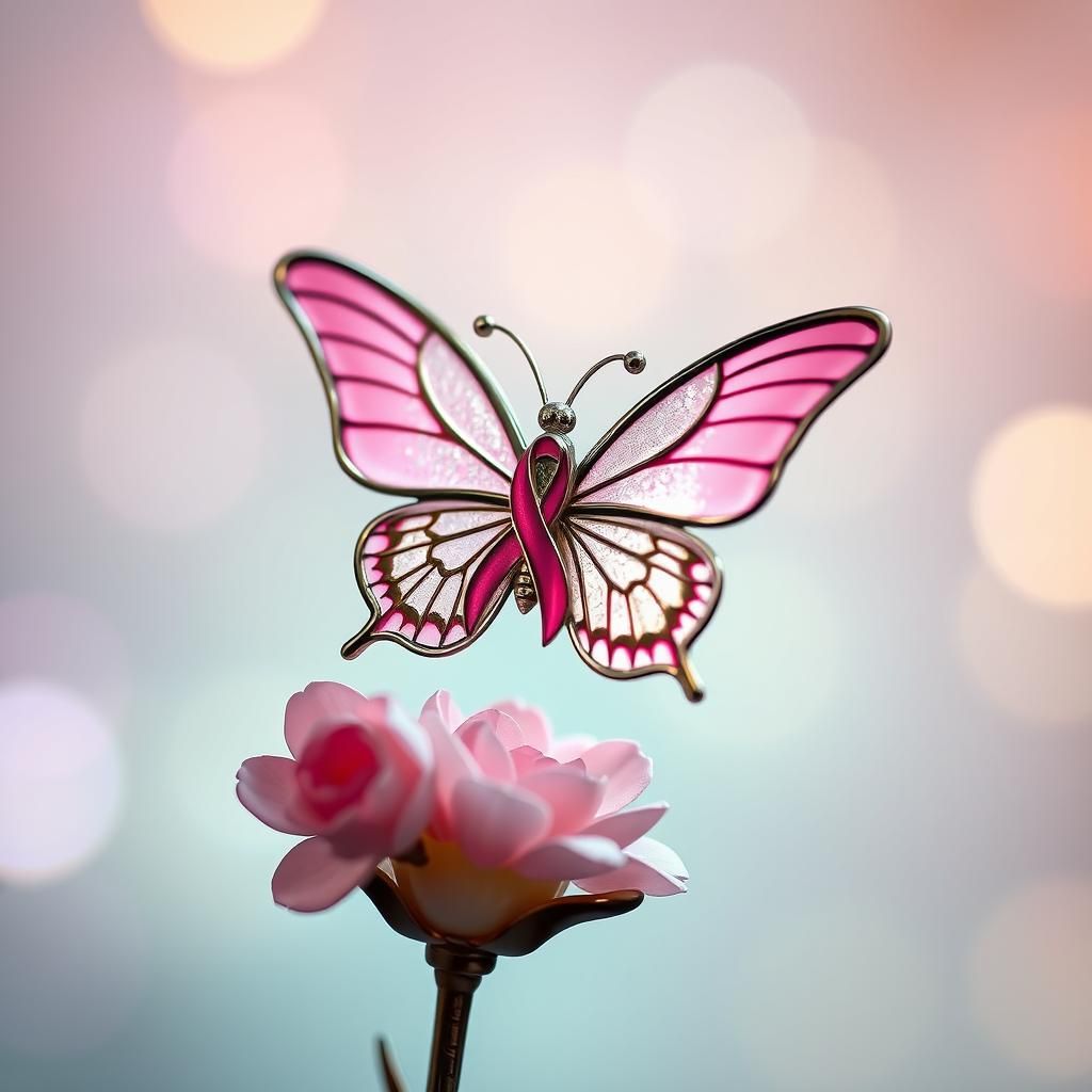 This image shows a delicate enamel glass butterfly figurine with a pink breast cancer ribbon wing. Soft pastel bokeh lights and a gradient background enhance the vintage feel.