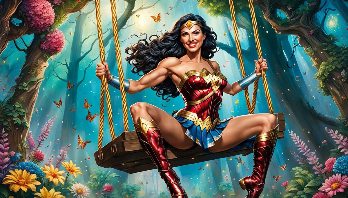 This image shows Wonder Woman smiling and relaxing on a flower-adorned swing in an enchanted forest. This hyperrealistic portrait features intricate details and a colorful, high-contrast aesthetic reminiscent of street art.