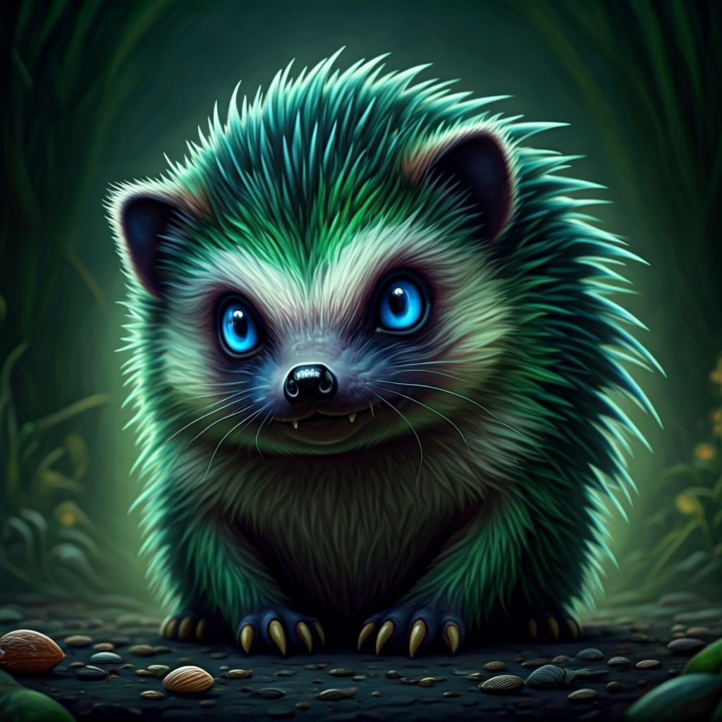 “On the spooky 8th day of Halloween, meet Willow! She's a daring little hedgehog with vibrant green fur and sleek black quills. Her glowing blue eyes sparkle with mischief and her tiny black nose twitches eagerly. Living in a mysterious, mist-shrouded garden, Willow is a brave explorer of the night. She uses her razor-sharp teeth to crack open shells and savor delicious snail treats. With her keen nose, she digs and hunts for hidden treasures beneath the earth, always ready for her next adventure!”