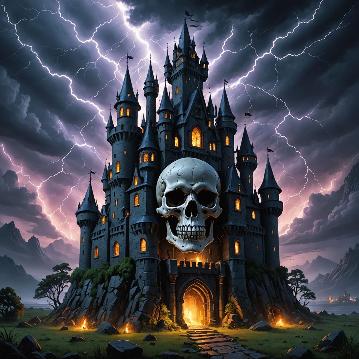 This dark fantasy digital matte painting depicts a skull castle under a dramatic lightning storm. Features dynamic lighting and intricate details in a comic book art style.