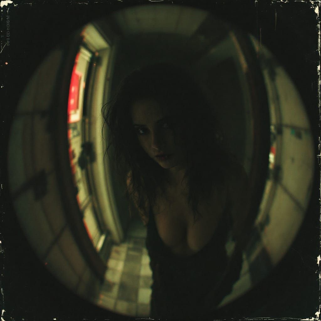 This image displays a grainy, low-resolution CCTV camera view of an attractive young woman, featuring a timestamp and static lines. The aesthetic evokes suspenseful, found footage from the early 2000s.