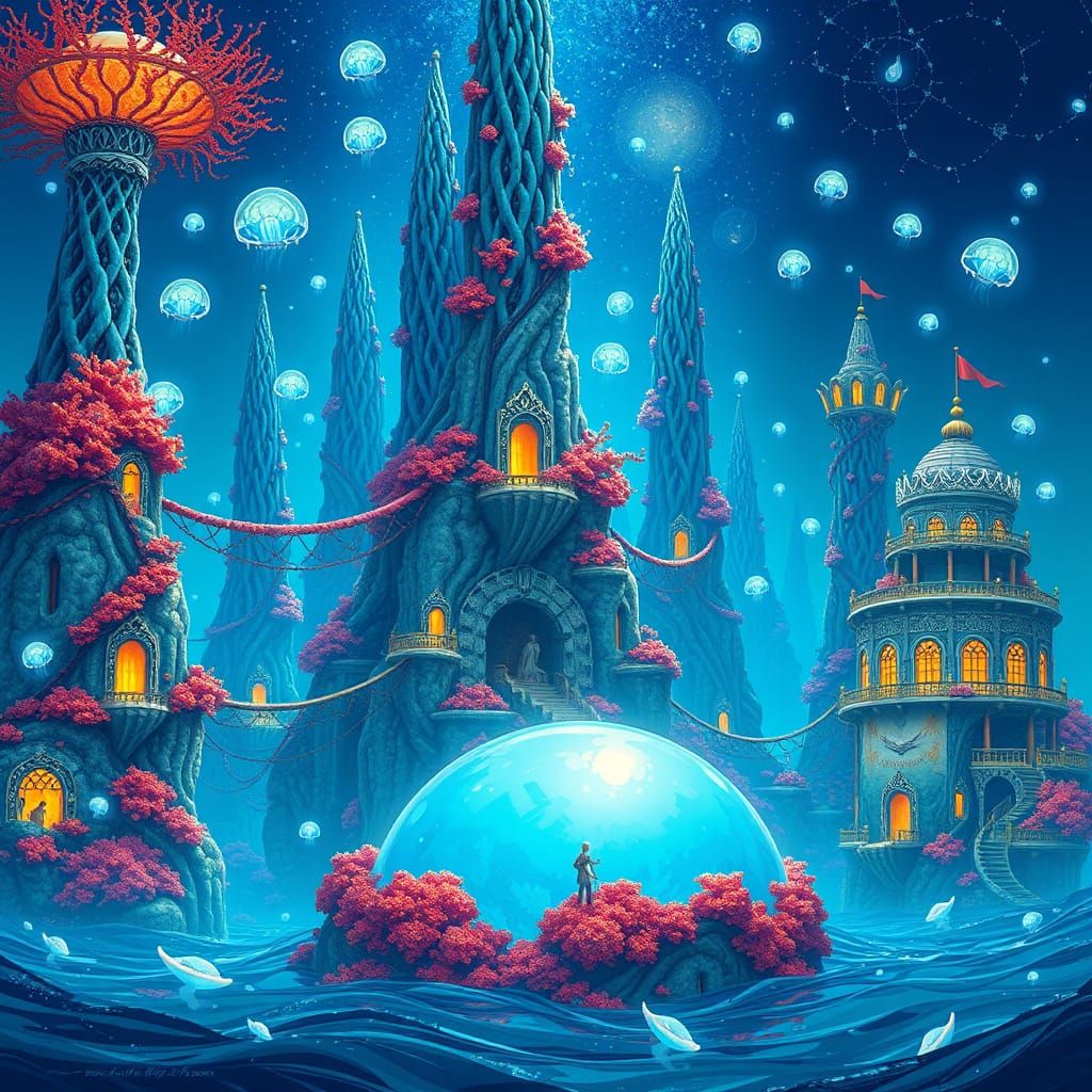 This image depicts a fantastical underwater city with towering coral spires, shimmering jellyfish, and glowing bioluminescent chandeliers. A mix of futuristic and oceanic elements creates a unique cyberpunk atmosphere.