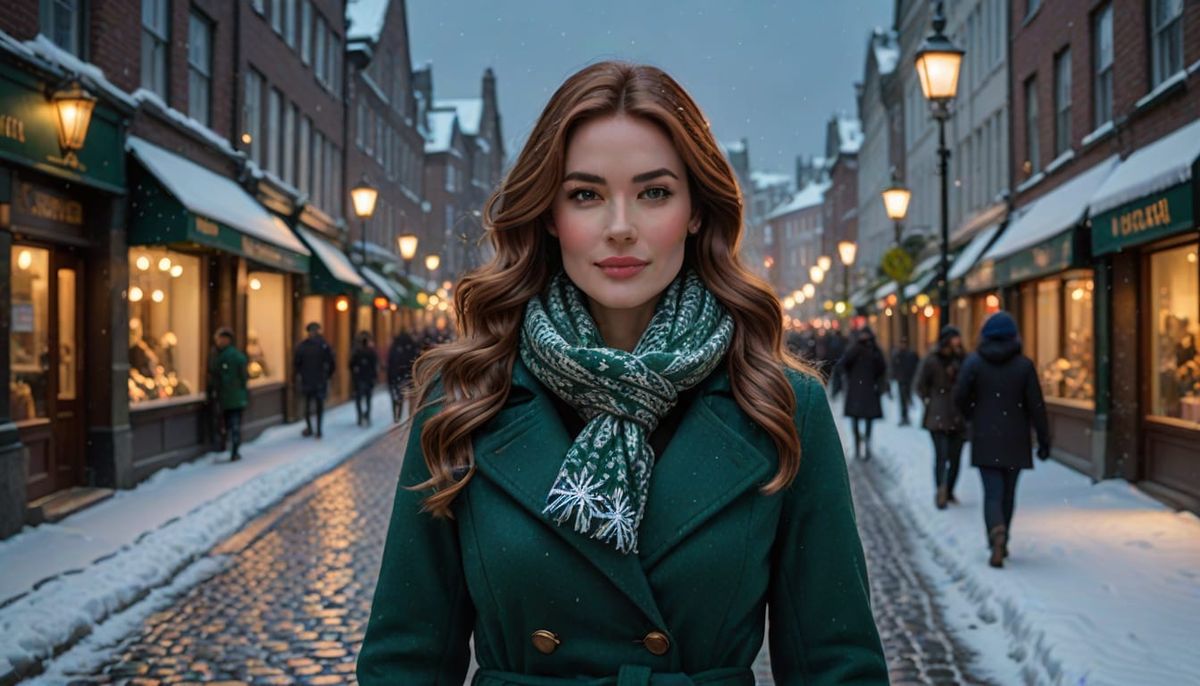 This image shows a hyperrealistic portrait of a woman with auburn hair in a green coat and white scarf. The background features a winter city street at dusk with snow, street lamps, and buildings, rendered in 8k.