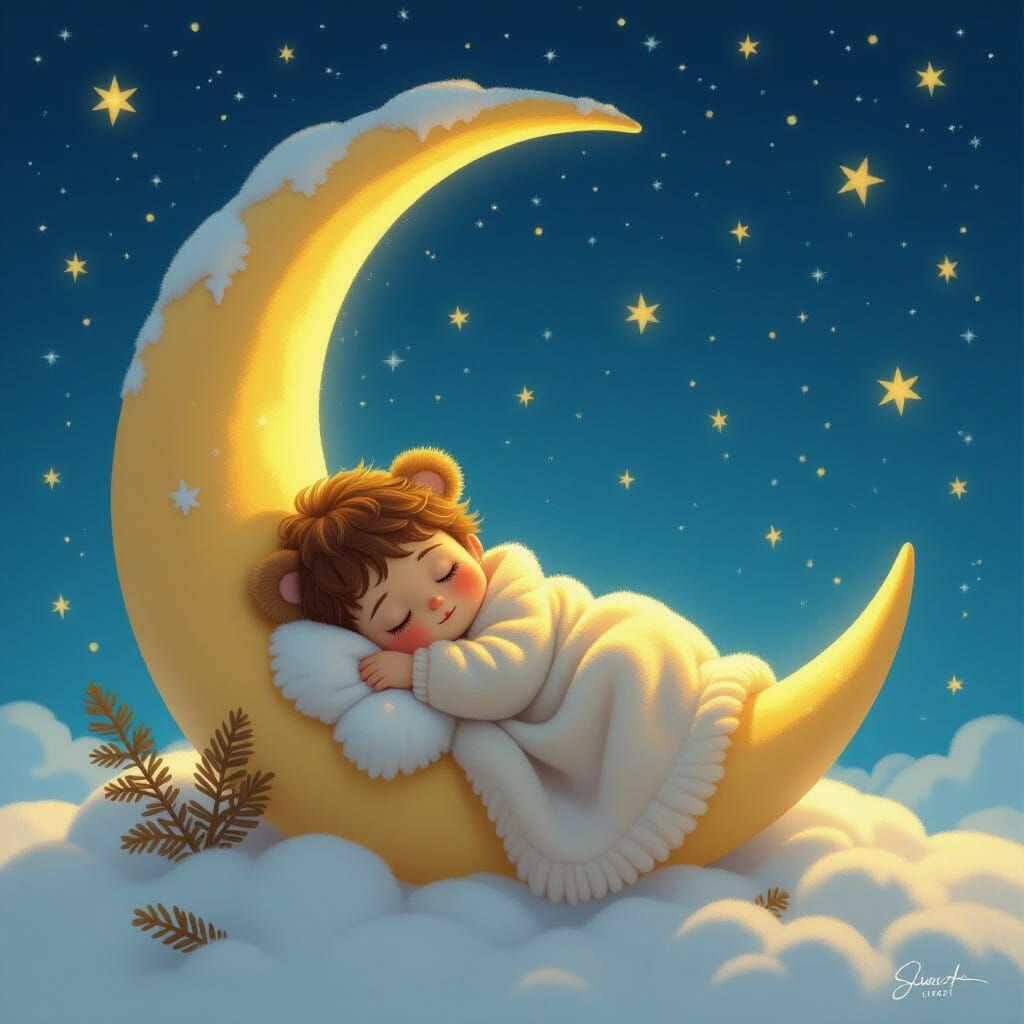 A surreal digital illustration featuring a teddy boy sleeping on a moonlit crescent, wrapped in a cozy blanket amidst stars and snowflakes. The art combines impasto oil textures with volumetric lighting and split-complementary colors.