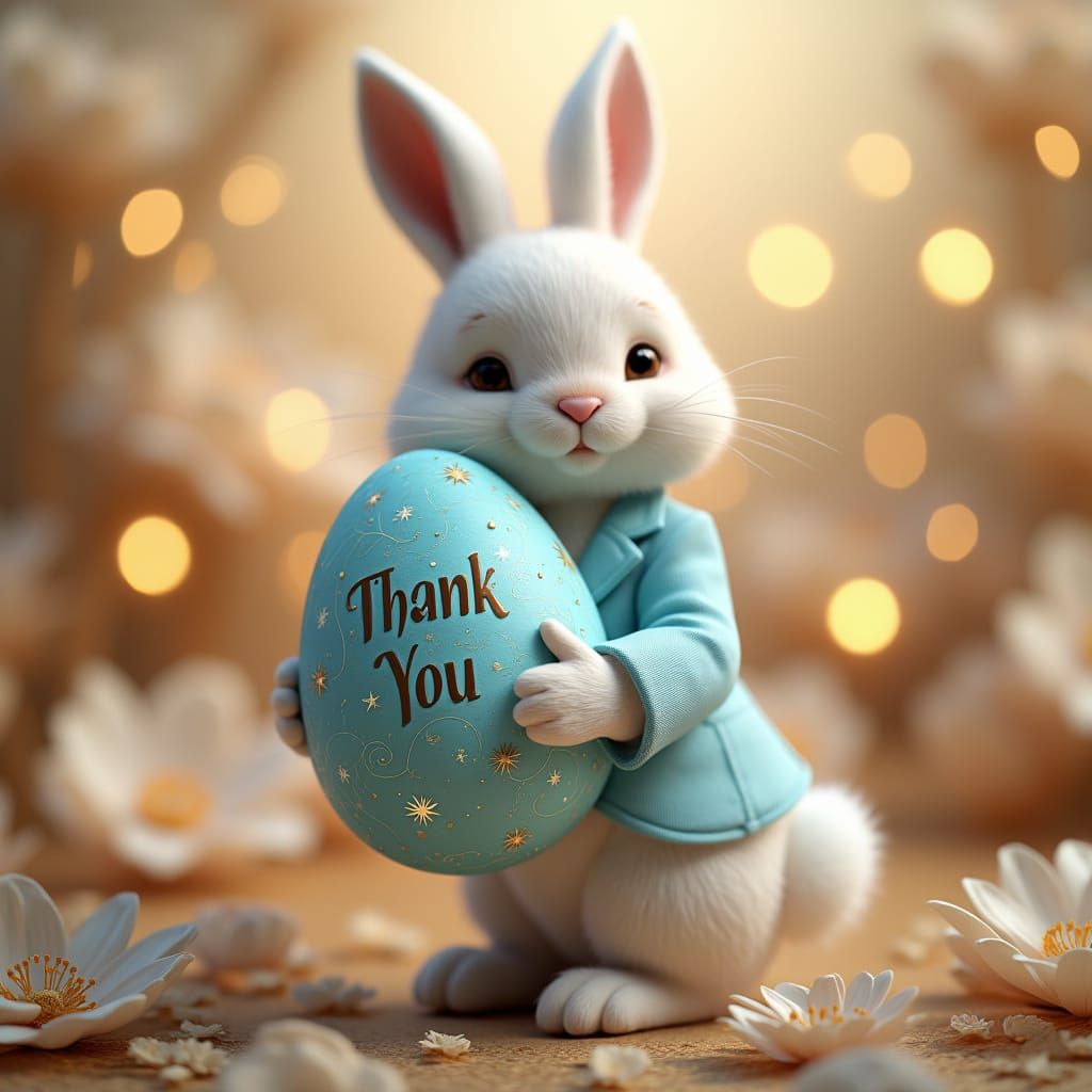 This charming image features a photorealistic Easter Bunny in a soft pastel blue suit, holding a luminous blue egg with intricate star designs and elegant cursive lettering. The bunny stands against a stunning gold floral background with delicate petals and a warm, dreamy atmosphere.