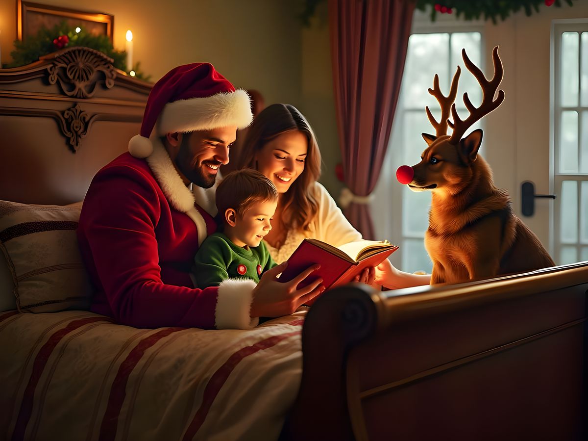 A cozy Christmas scene unfolds in a master bedroom, featuring a majestic sleigh bed and a family reading 'Rudolph the Red-nosed Reindeer' together