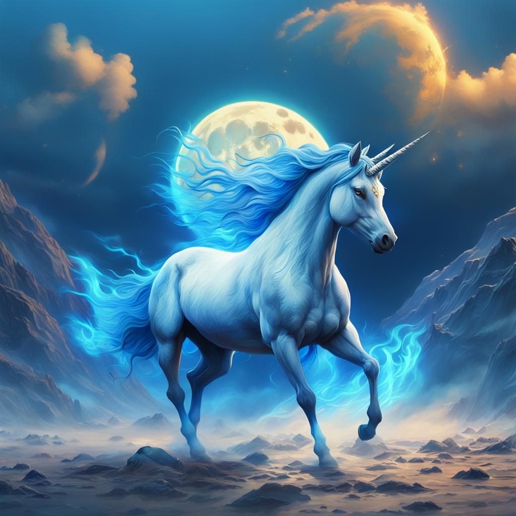 A striking picture of a unicorn ablaze with blue flames walking on a moon. The digital painting features golden wings, a low angle shot and fantasy concept art with ethereal and mystical elements.