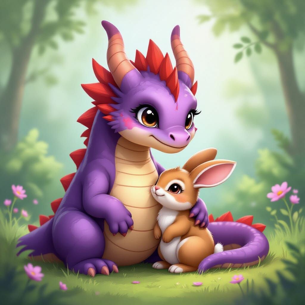 This image shows a majestic purple dragon tenderly guarding a small baby bunny. The dragon's scales shimmer in the light as it watches over the vulnerable creature.