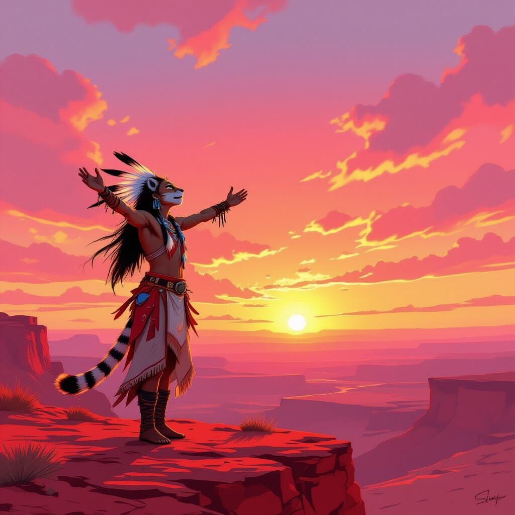 This image shows a half-human, half-cougar shaman singing on a desert cliff as the sun rises. The vibrant sky blends pink and gold in a fantastical style.