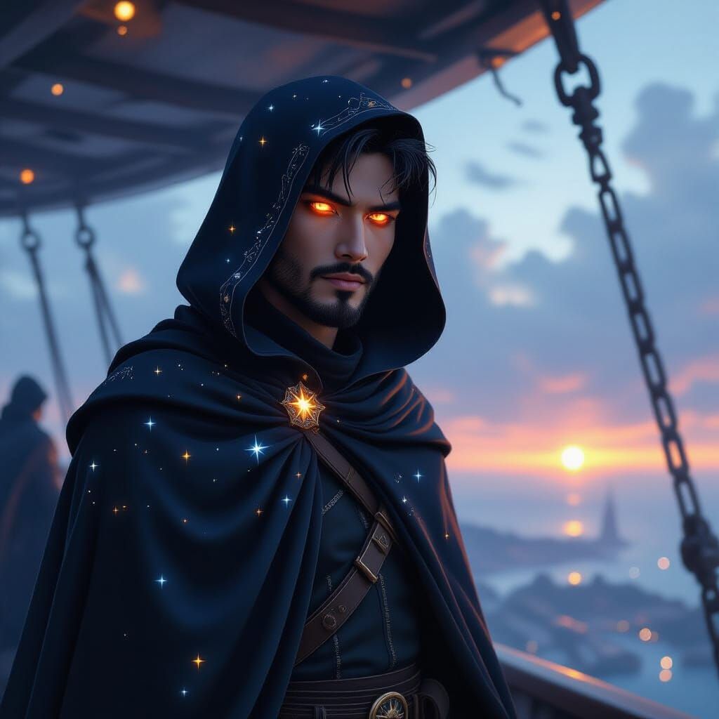 This image shows an Asian man on an airship deck overlooking a fantasy landscape. The figure wears a star-dotted cloak, has glowing eyes, and is rendered in a cyberpunk aesthetic with intricate details and atmospheric lighting.