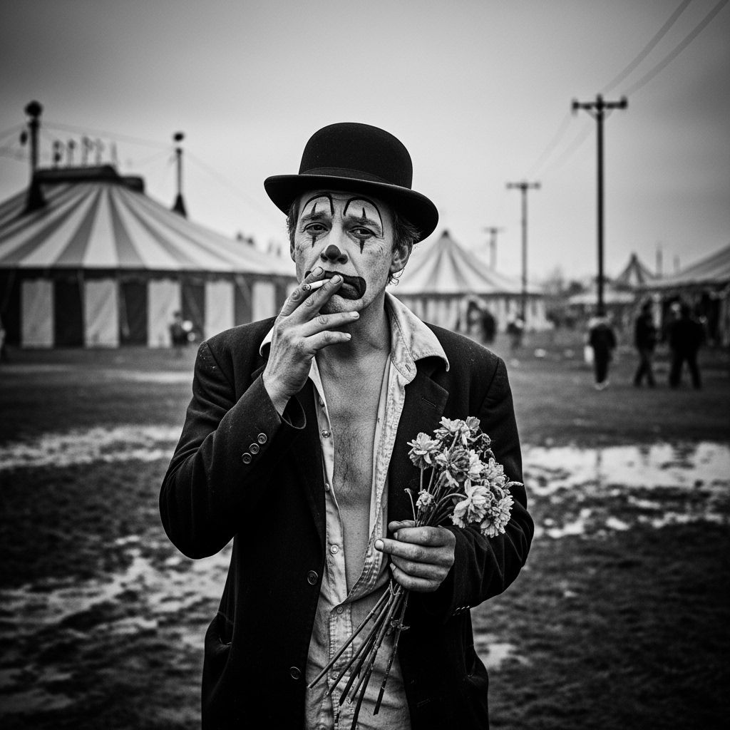 This image shows a solitary clown in a documentary-style black and white photograph. He wears sad makeup, a bowler hat, and holds a cigarette and wilted flowers on desolate circus grounds.