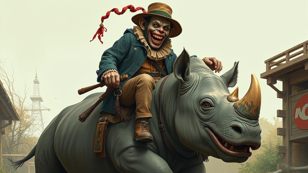 A bizarre image of a zombie monkey clown riding a rhinoceros. The figure is dressed in tattered clothing and grinning. The artwork is in a vibrant, whimsical style, with bold lines and bright colors.