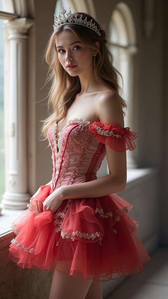 A full-body photograph of a princess in a delicate, off-shoulder baroque dress, smiling by arched windows with dramatic, diffused lighting.