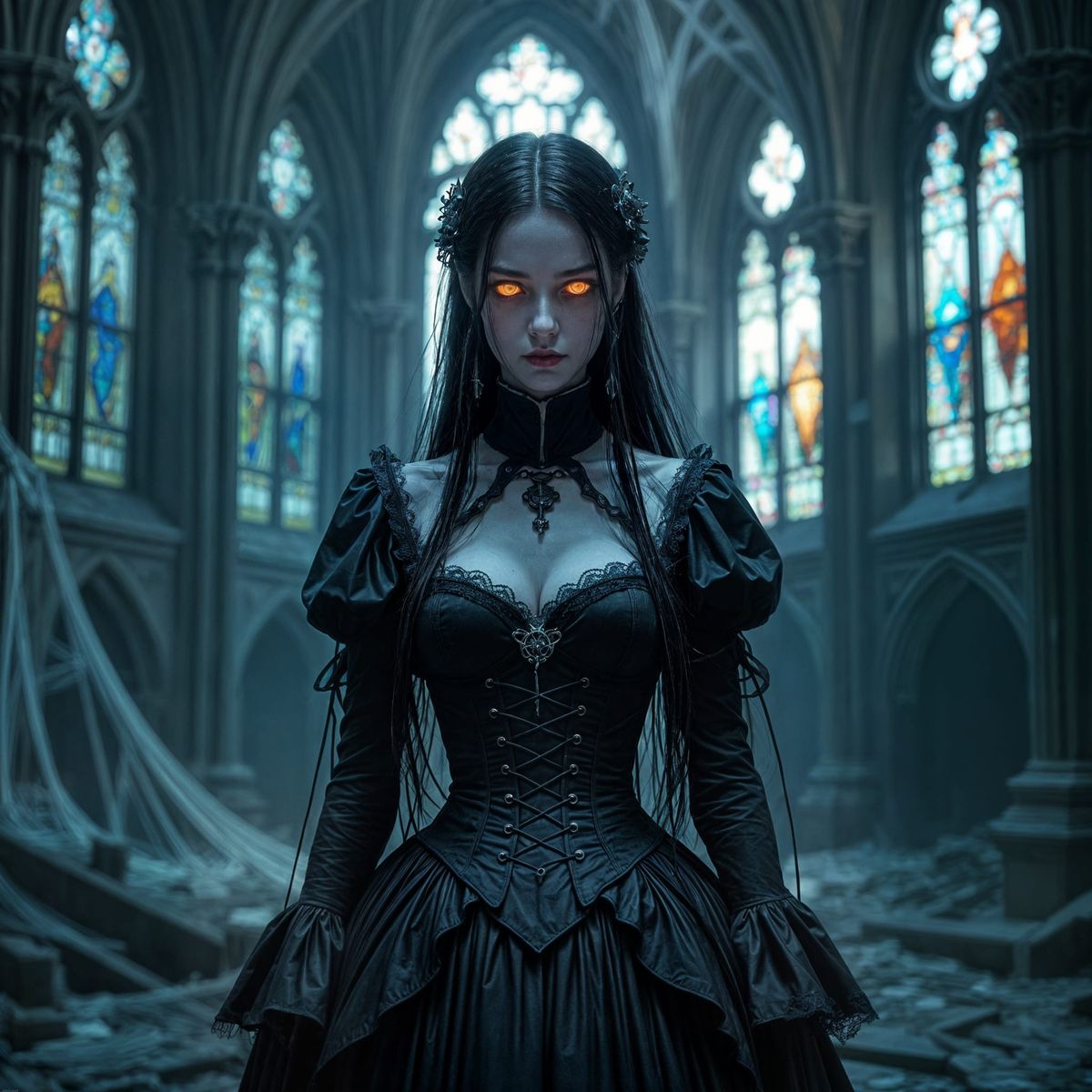 This image shows an android in a ruined cathedral. The android has porcelain skin and glowing eyes, set against a gothic horror backdrop with strong light and shadow in a photorealistic style.