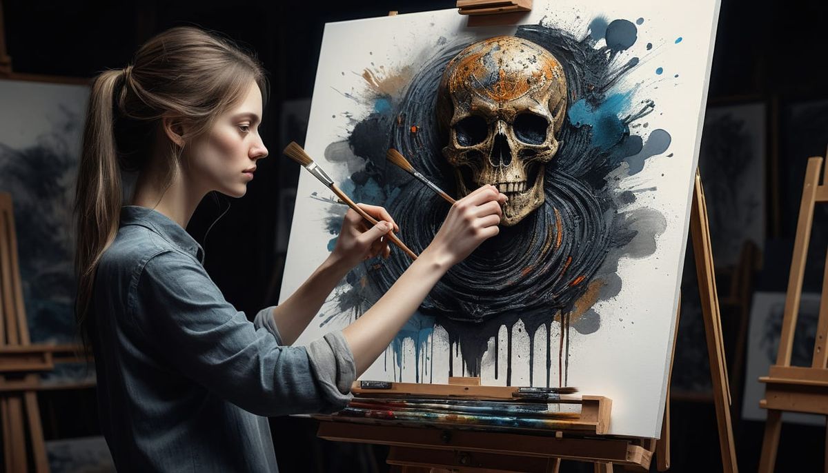 This image shows a girl standing at an easel, holding a brush. The portrait utilizes expressive brushstrokes and calligraphy in a vibrant watercolor style, set against a dark, muted background. The artwork is intricately detailed.