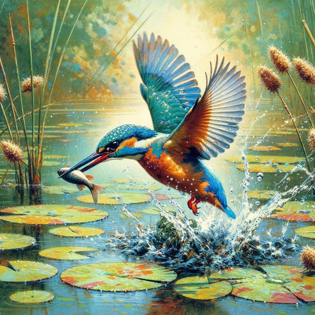 This image shows a kingfisher bird in a dynamic dive towards a pond. It features textured brushwork and vibrant colors, reminiscent of impressionistic art.