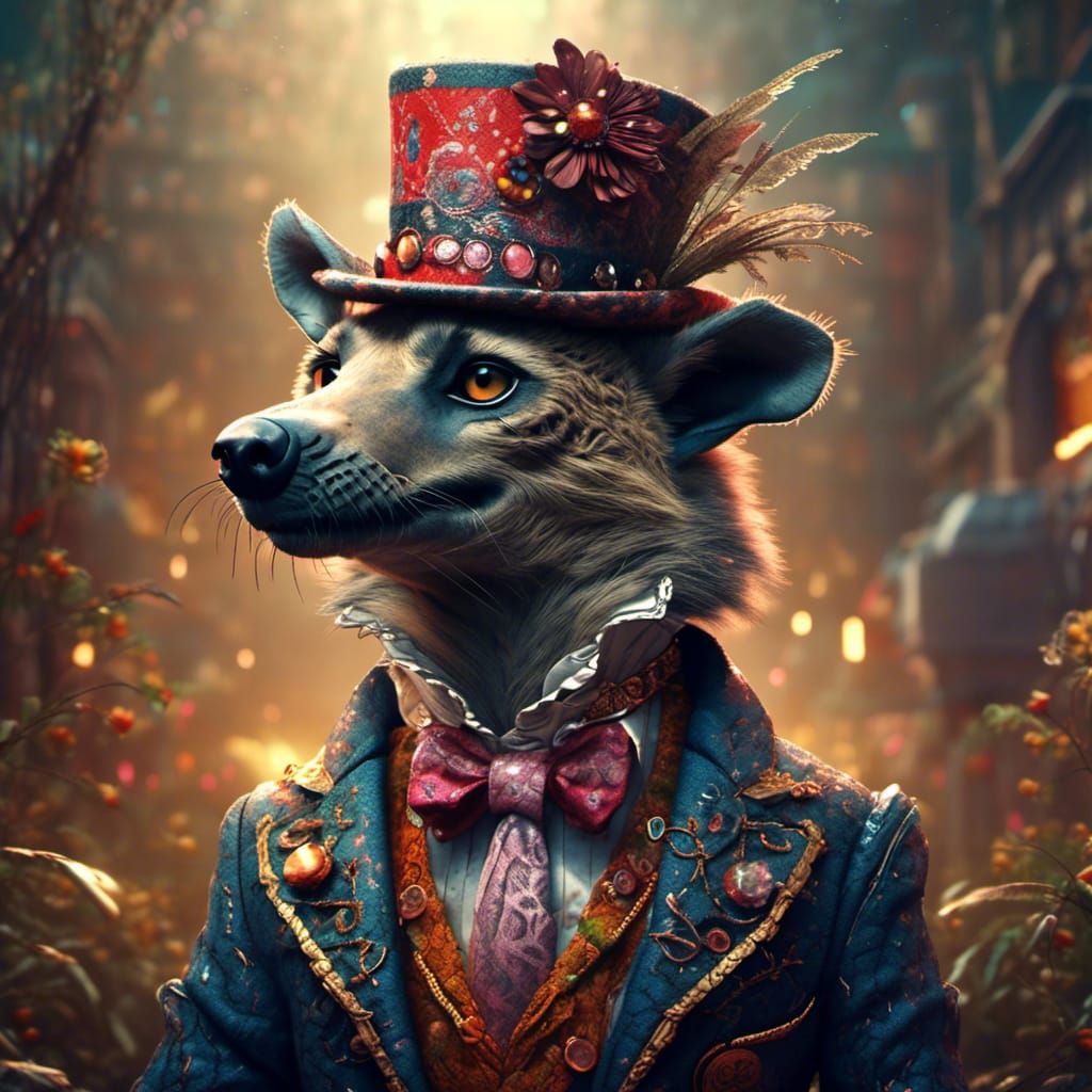 This image shows a crochet hyena wearing a top hat. The digital matte painting style is colorful, detailed, and cinematic, creating a dramatic and atmospheric scene.