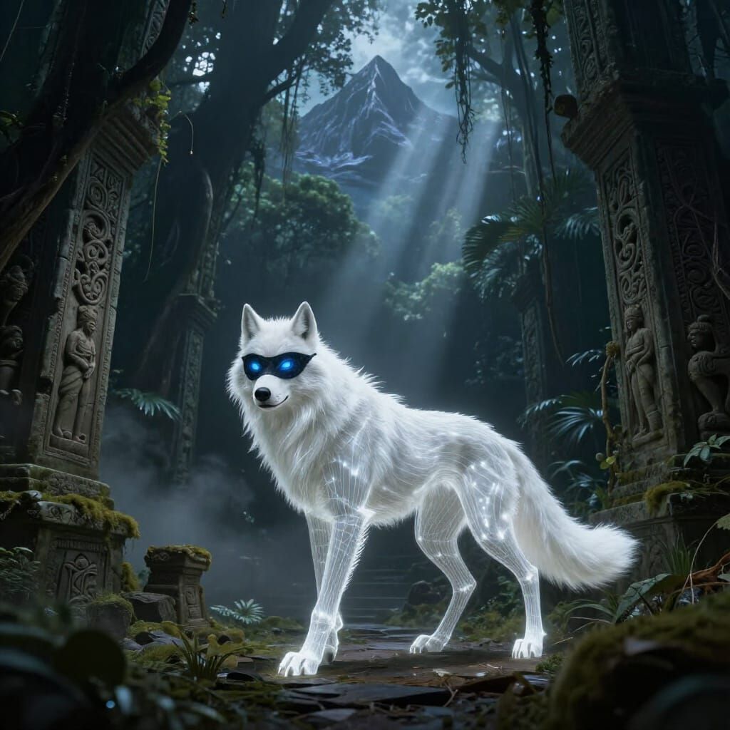 This image shows a mystical wolf woman with glowing eyes and ethereal stripes, offering a luminous hand in an ancient jungle temple. Dramatic lighting and mist create a dark fantasy atmosphere, rendered with hyperrealistic detail.