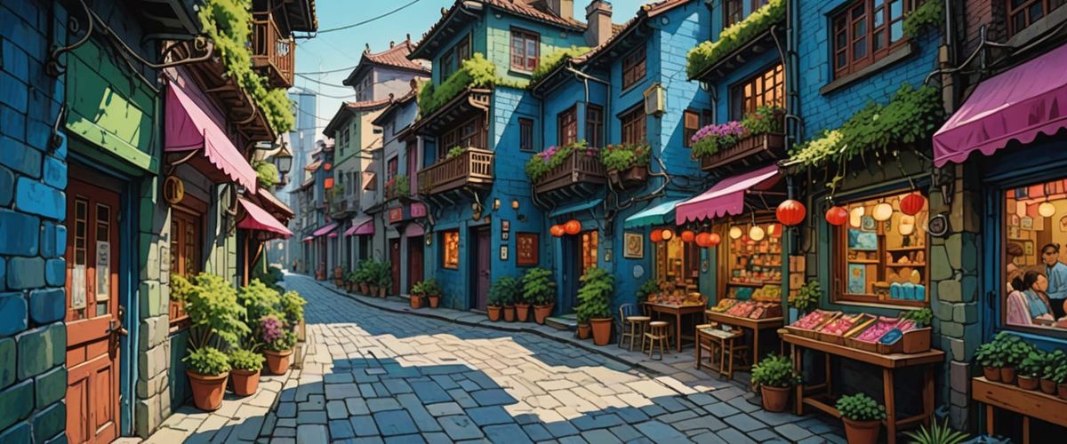 A vibrant watercolor of a Shanghai market district. The image features a winding path, M.C. Escher-inspired architecture and volumetric lighting. The comic book style art uses indigo and magenta accents.