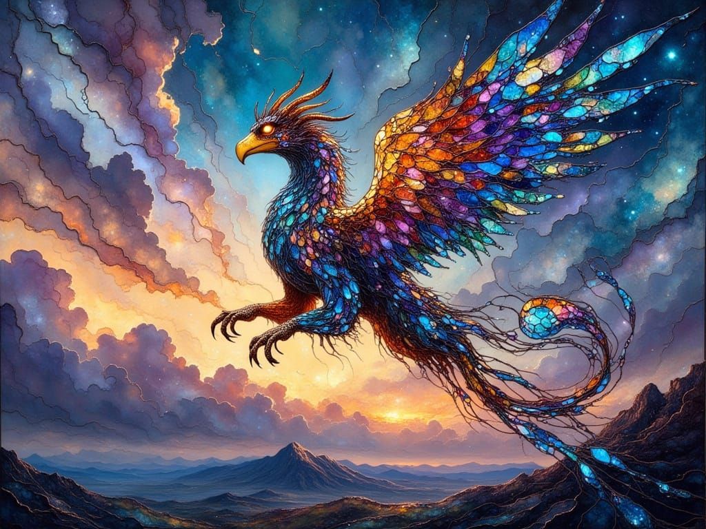 A captivating image of a griffin composed of stained glass flying at dusk. The twilight sky is filled with swirling colorful clouds in a detailed, fantastical concept art style.