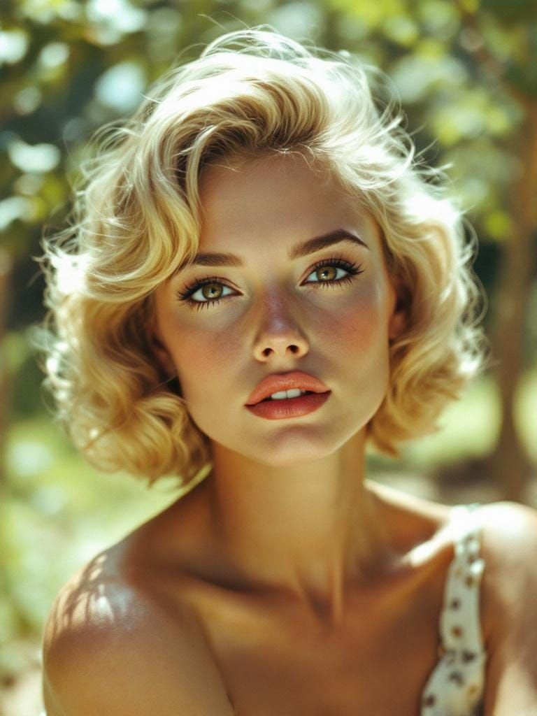 A striking picture of a 1950s pin-up woman enjoying a summer day in the park. The image is a fusion of styles featuring distorted photographic composition and fragmented typography with digital glitches.