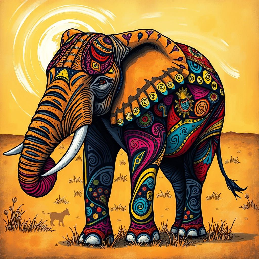 This vibrant painting features a majestic elephant with swirling, tribal-inspired stripes, set against a warm savannah backdrop, blending impressionist brushstrokes and realistic textures, with bold lines and intricate details