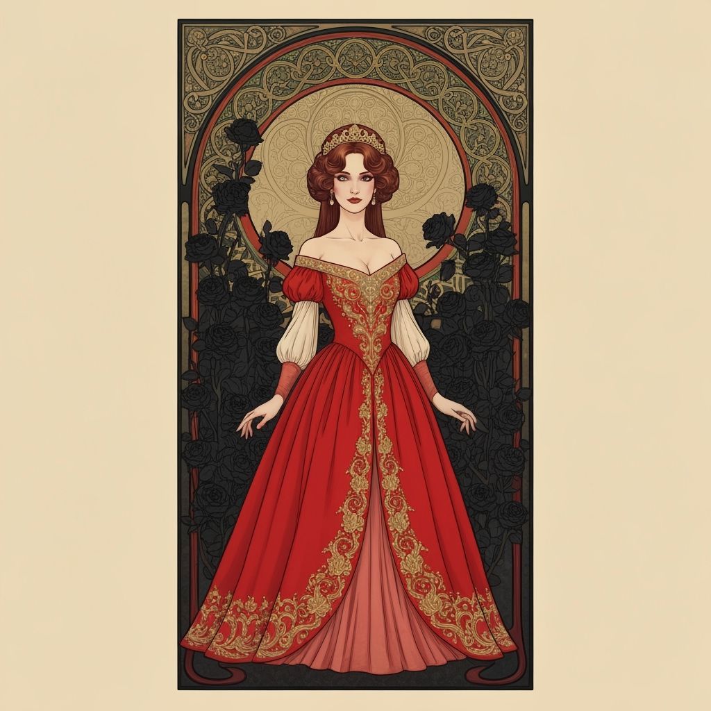This image depicts an elegant princess in a luxurious red gown, set within a mysterious garden abundant with black roses. The artwork features intricate Art Nouveau details and dramatic lighting, evoking romanticism.