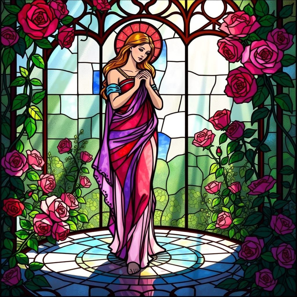 This stunning stained glass image depicts the Roman goddess of love, Venus, surrounded by blooming roses and lush greenery in a serene garden. Inspired by Art Nouveau and Byzantine mosaic art, the vibrant colors and intricate designs evoke a sense of timeless beauty.