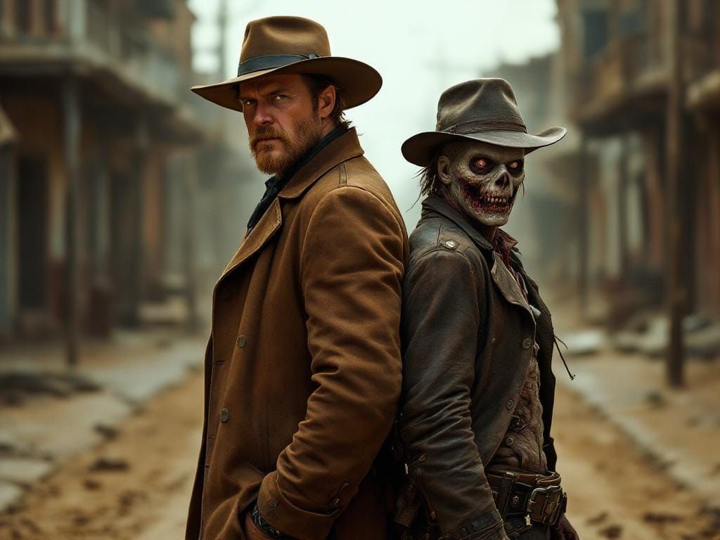 A striking picture of Doc Holliday confronting a zombie in a deserted street. The scene has a hyperrealistic, cinematic quality with high contrast and intricate textures, reminiscent of digital art.