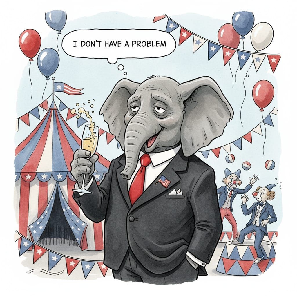 This minimalist ink and watercolor illustration depicts a tipsy anthropomorphic GOP elephant in a tuxedo at a circus, revealing a satirical political commentary with a spilled champagne glass and a thought bubble. The art style is reminiscent of New Yorker cartoons.