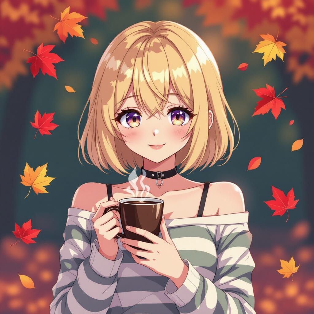 This image shows an anime girl with blonde bobbed hair in a straitjacket, holding chocolate and coffee in an autumn landscape. Rendered in a flat, cel-shaded manga style with warm, cinematic lighting and pastel colors.