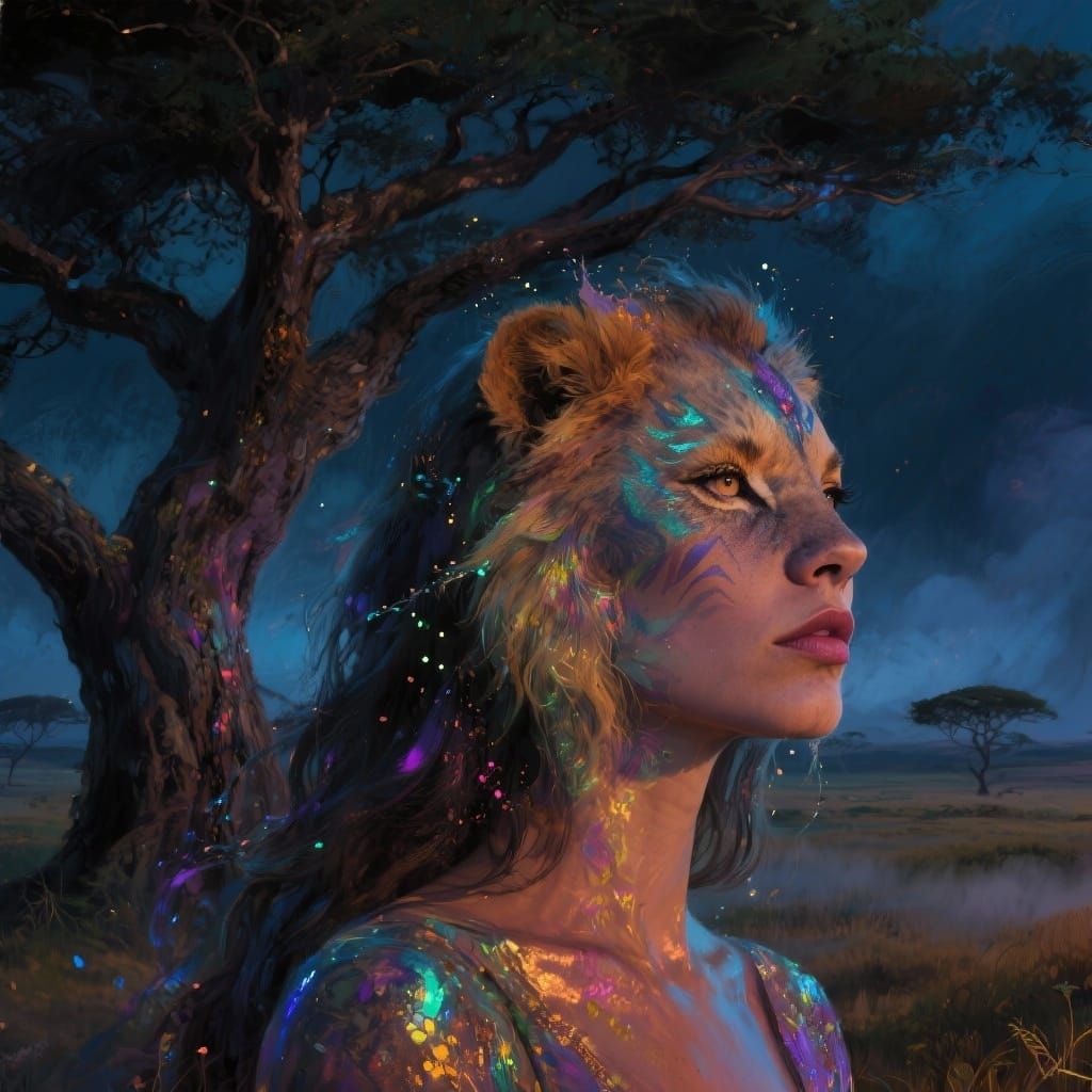 Double exposure professional photography of an close up portrait attractive woman with lioness face paint, double exposure professional photography impasto Serengeti tree at night, mist, reflections, inspiring, shimmering, vibrancy, fantasy concept art. Detailed matte painting, deep color, fantastical, ...