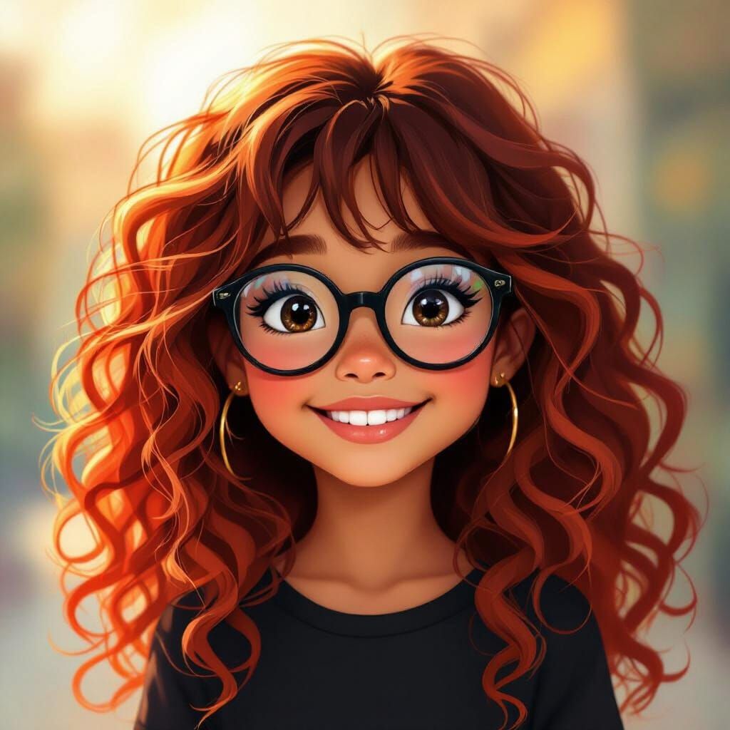 A 12-year-old Black girl with long, red, curly hair and glasses smiles joyfully. Rendered in a vibrant, illustrative style with warm sunlight.
