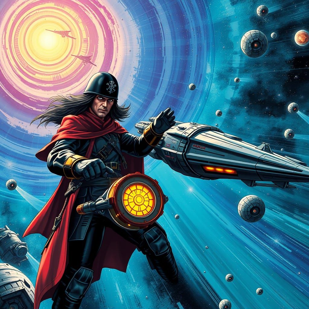 A striking holographic illustration of Captain Harlock piloting the spaceship Arcadia, amidst a swirling cosmic backdrop, blending traditional and digital media with intricate details and textures.