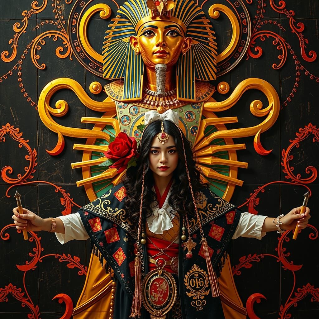 A highly detailed, photorealistic full body image capturing Harlequin, Geisha, and Tutankhamun figures with sharp focus and natural colors.