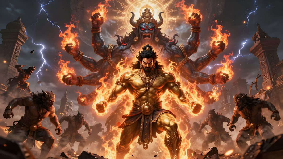 A powerful warrior hero with a golden aura battles a gigantic, four-armed demon surrounded by monstrous warriors. The scene is filled with intense divine and demonic fiery energy.