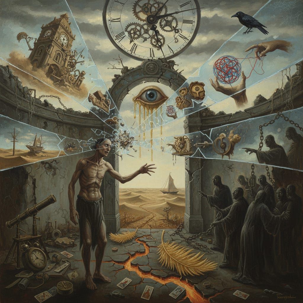 This surrealist painting captures a psychic's confusing glimpses of the future, rendered with dramatic lighting and a moody color palette, evoking dreamlike unease.
