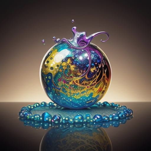 This image is a surreal oil painting featuring glass spheres and multicolored pearls in a melting, abstract scene with warm, golden lighting and shimmering colors.