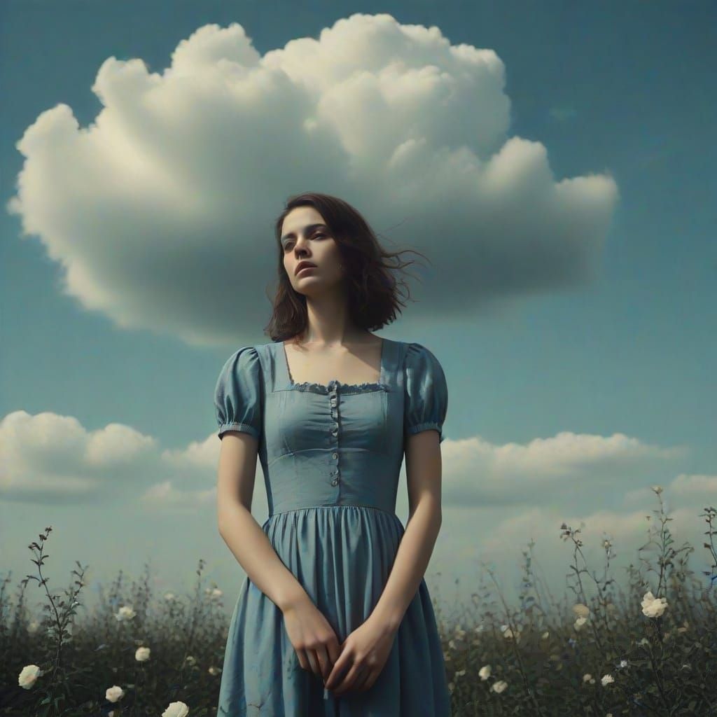 A surreal medium shot of a woman in a vintage blue dress against a moody sky. Delicate petals surround her, creating a dreamlike, melancholic atmosphere with muted colors and soft focus.