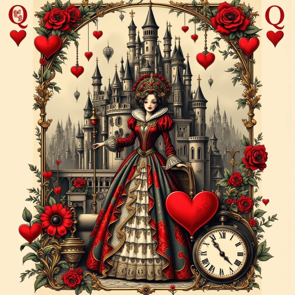 A vintage playing card design featuring the Queen of Hearts, gothic castle, and flowers. This whimsical, storybook-style image has an aged paper texture and Alice in Wonderland theme.